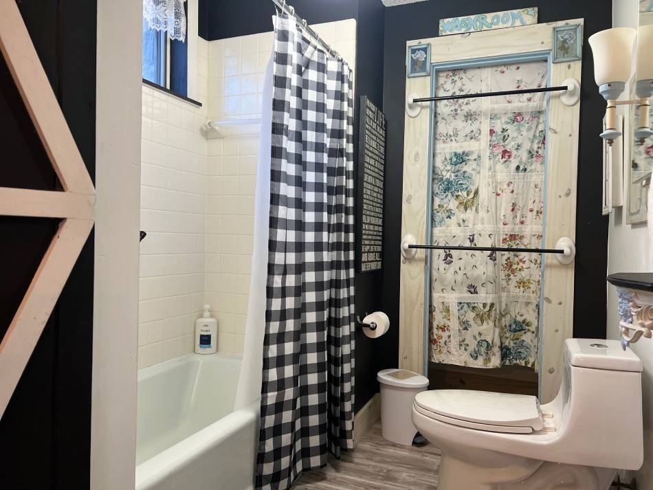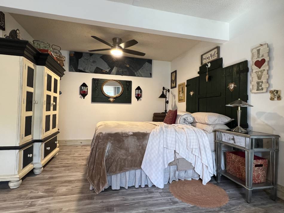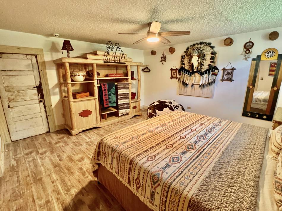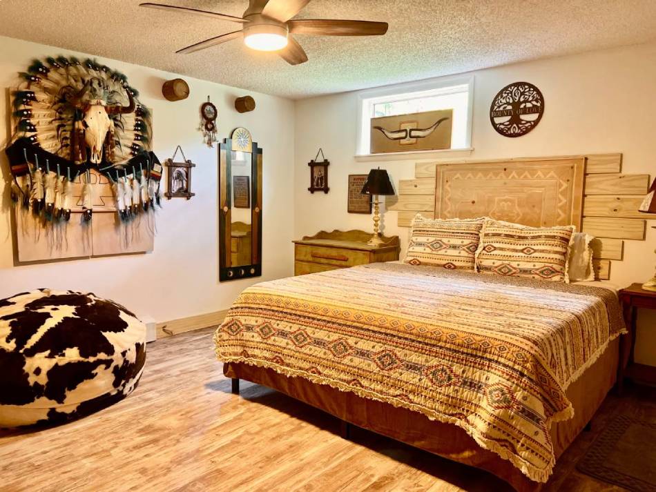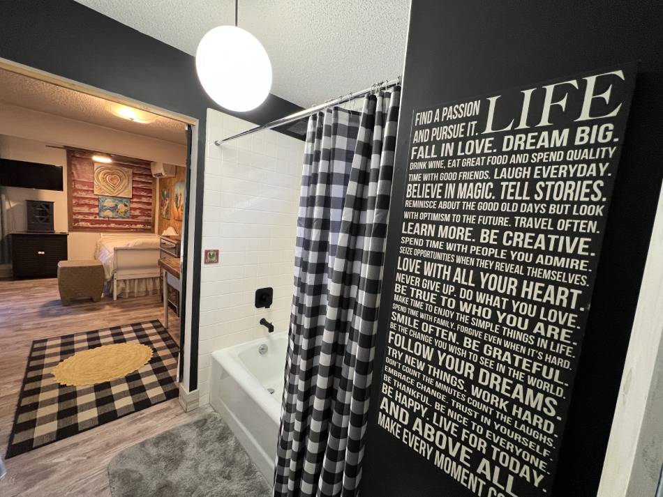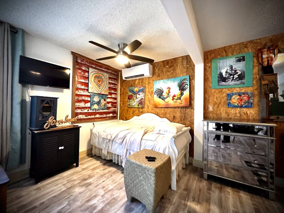 South by Southwest is 230 Sq ft., has one King bed and a shared full bath with Country Cozy.