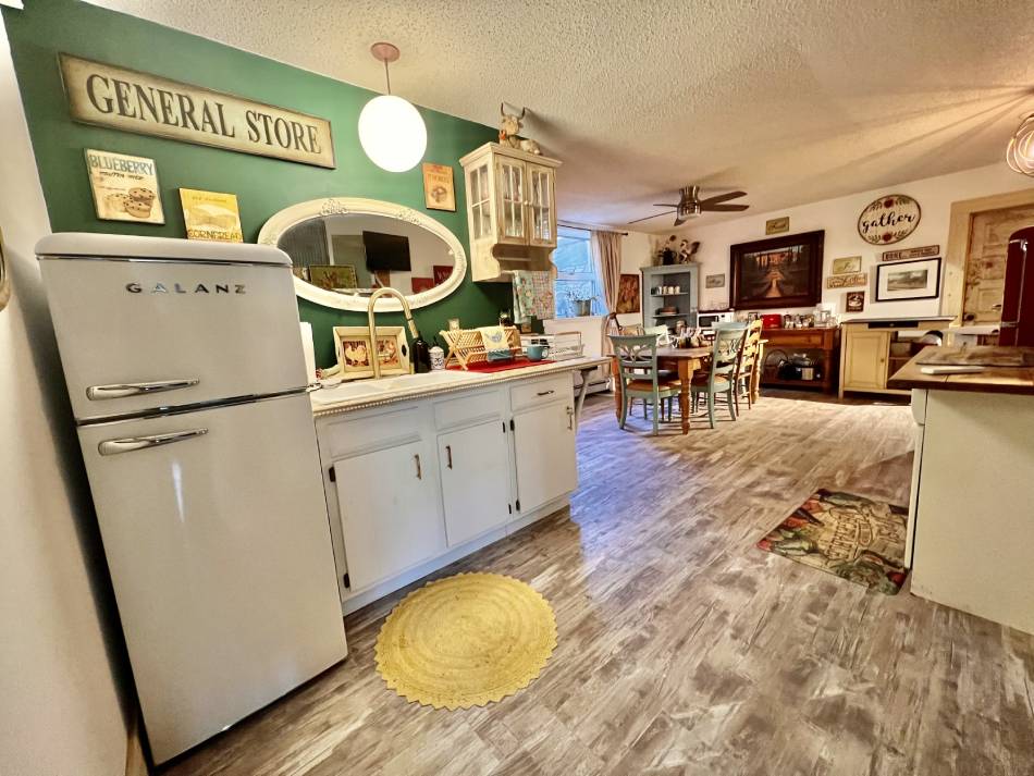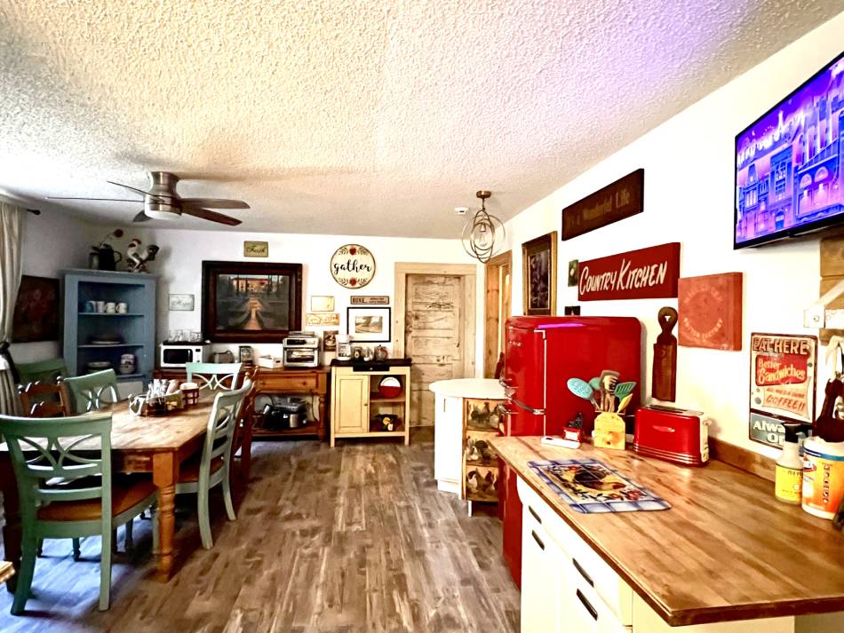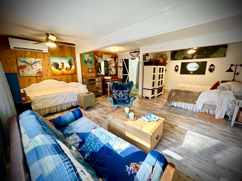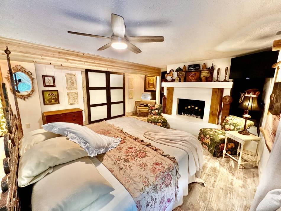 The Country Cozy is 420 Sq ft., has one king bed, an oversized twin, a wood burning fireplace and shares a full bath with South by Southwest.